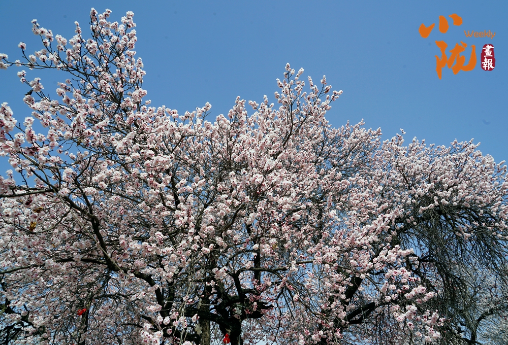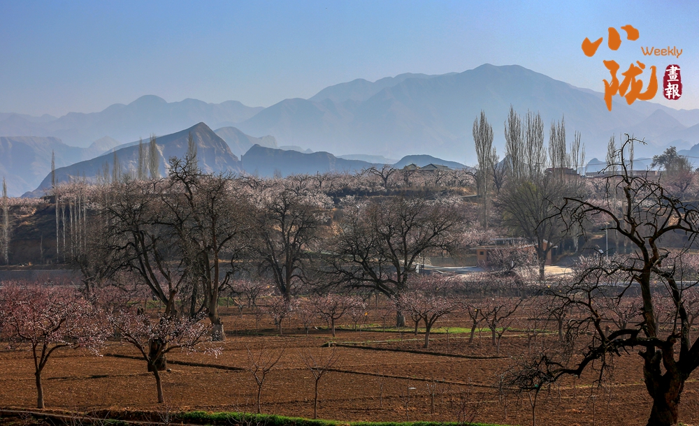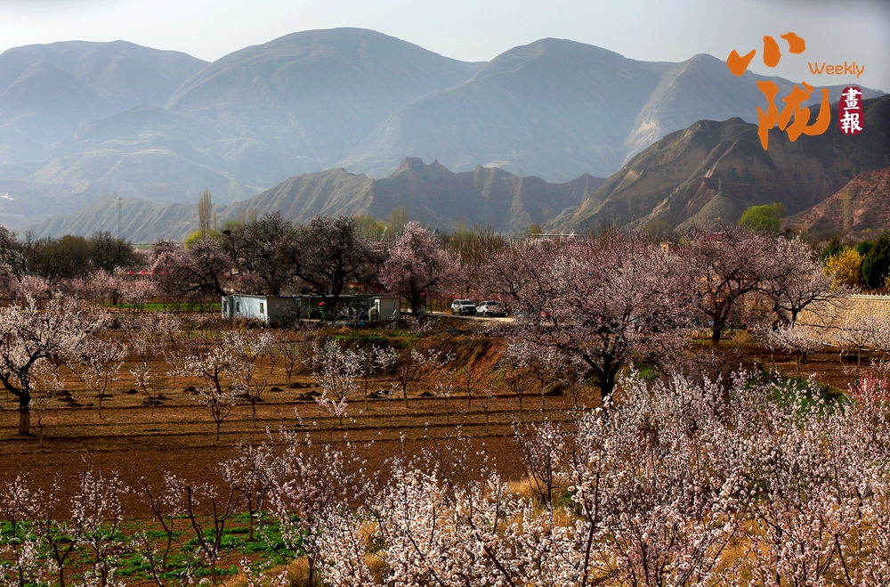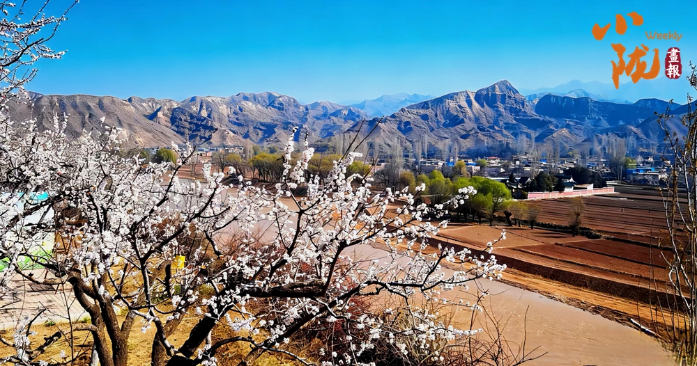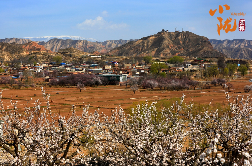 春风吹过唐汪川,山野泛起轻柔的涟漪。粉白相间的杏花漫山遍野,次第绽放,村舍错落有致,掩映于花树间。远望层峦叠嶂,山顶尚余残雪,与近处的花海构成一幅山野春景图。