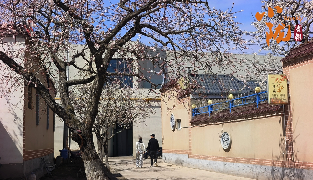 古村落小巷,粉白杏花缀满枝头,暖阳轻洒在青砖黛瓦与斑驳院墙上。一老一小缓步前行,衣袂扬起细碎的春光,墙角的“人生”牌匾,为这烟火日常添了几分悠然诗意。