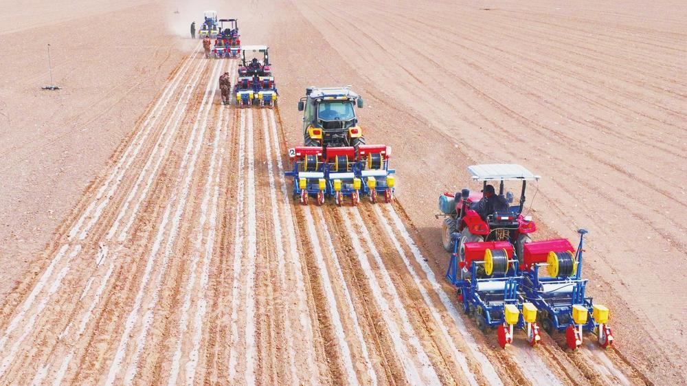 张掖市甘州区沙井镇制种玉米基地正在开展机械化播种作业。 (甘州区委宣传部供图)