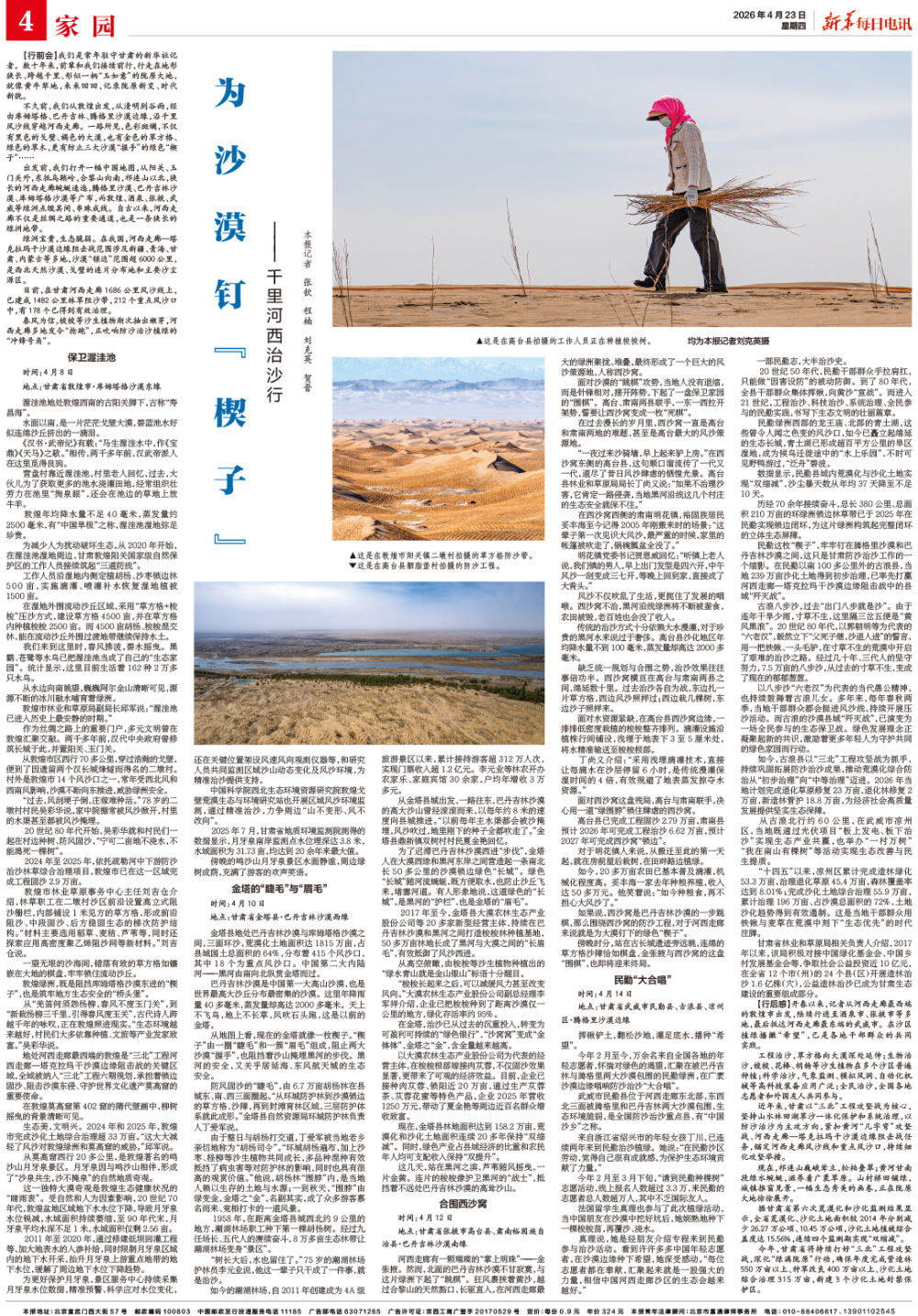 【行后感】开春以来,记者从河西走廊最西端的敦煌市出发,陆续行进至酒泉市、张掖市等多地,最后抵达河西走廊最东端的武威市。在沙区植绿播撒“希望”,已是各地干部群众的共同实践。