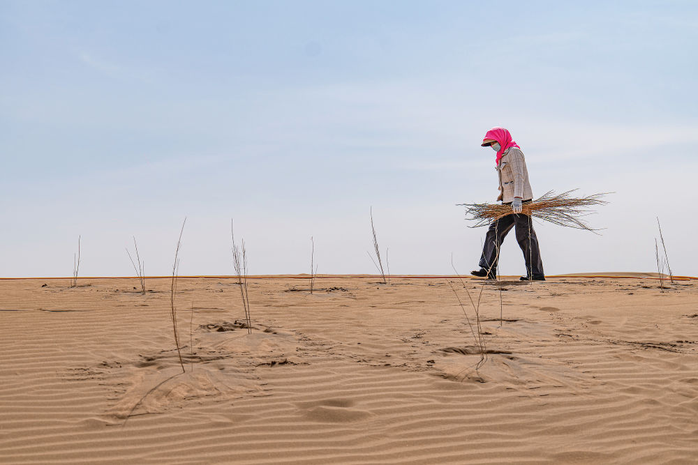 一望无垠的沙海间,错落有致的草方格如镶嵌在大地的棋盘,牢牢锁住流动沙丘。