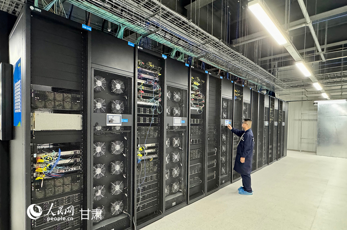 智算中心机房内,工作人员正在检查服务器运行状态。人民网记者焦隆摄