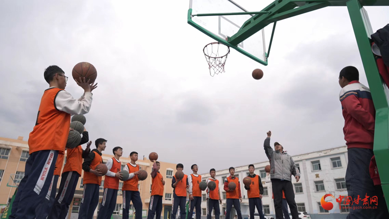 “公益体彩 快乐操场”活动爱心传递到兰州市永登县民乐乡初级中学,七年级学生汪含宏在专业教练指导下完成标准投篮动作。