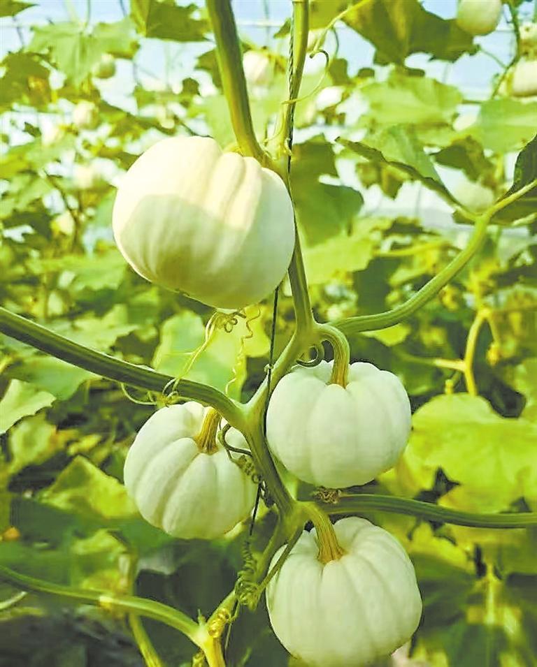 “白色的贝贝南瓜不同于深绿色、橘红色的贝贝南瓜,口感特别甜糯绵软,是市场上的‘网红’蔬菜,从日本引进原原种,在河西走廊试种成功后,目前在国内各个蔬菜基地示范推广。目前市场上1个白色贝贝南瓜售价12元。”韩文杰说,产业园今年6月定植的南瓜苗子,预计9月采摘上市,1亩地纯收入约3万元。