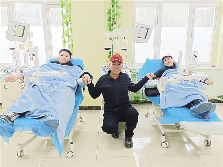 范金凤(右)和儿子一起献血,丈夫(中)陪伴身边