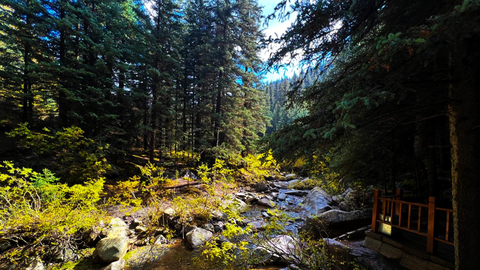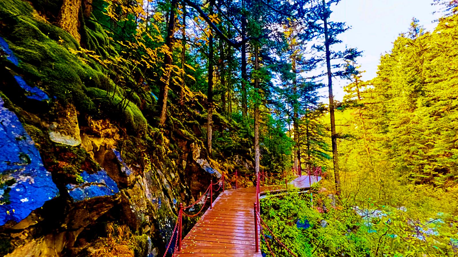 秋天的天空,被雨水洗得透亮。云朵不再翻滚,而是像被谁随意铺陈的丝绢,静静悬在雪峰之上。站在山腰仰望,幽蓝与洁白交织,心也随之变得辽阔。高大挺拔的松树林与低矮灌木相依而生,落叶铺就柔软地毯;蜿蜒山路在脚下延伸,溪水在岩缝间清唱。每一步,都是一幅飘逸的线条;每一眼,都是一帧酣畅的墨意。