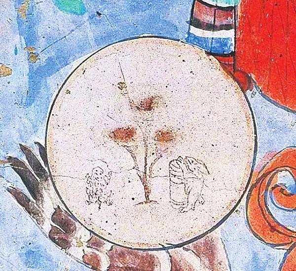 莫高窟第35窟中的“手托日月的十一面观音菩萨”中,菩萨左、右手分别托着太阳和月亮。细看菩萨手中的日月,里面竟大有天地——左手的太阳描绘着一只三组金鸟,右手中的月亮,清晰地描绘了捣药的玉兔、繁茂的桂树,以及旁边金蟾,画面极富浪漫主义色彩。