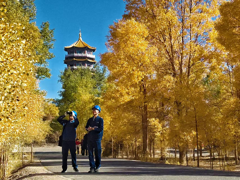 国网酒泉供电公司员工在金塔沙漠胡杨林景区开展节前巡视,确保双节期间景区供电安全可靠。王娜 摄