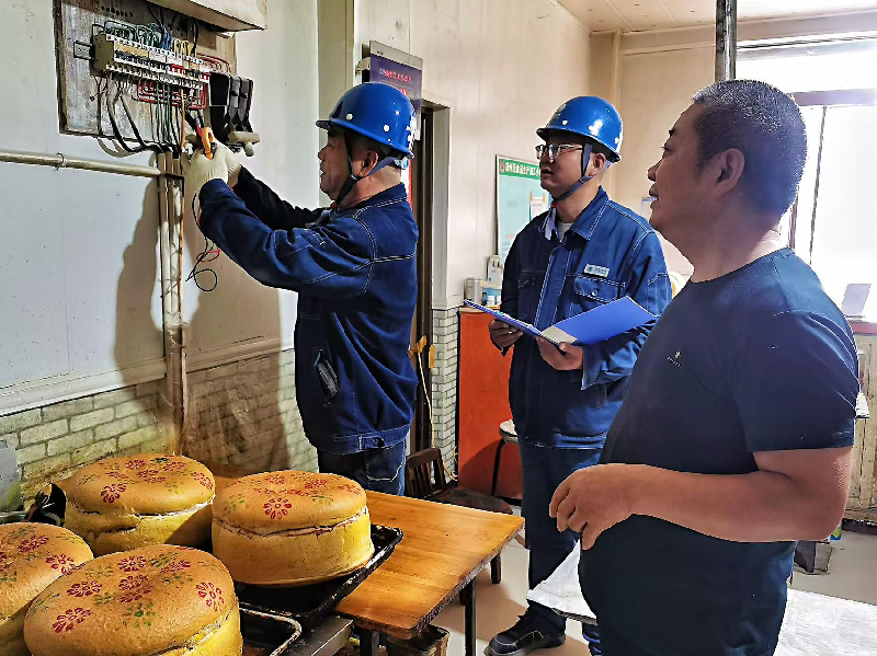 国网武威供电公司员工走进武威市凉州区永昌集市手工月饼加工作坊,为月饼食品加工客户开展用电安全检查。王龙 摄