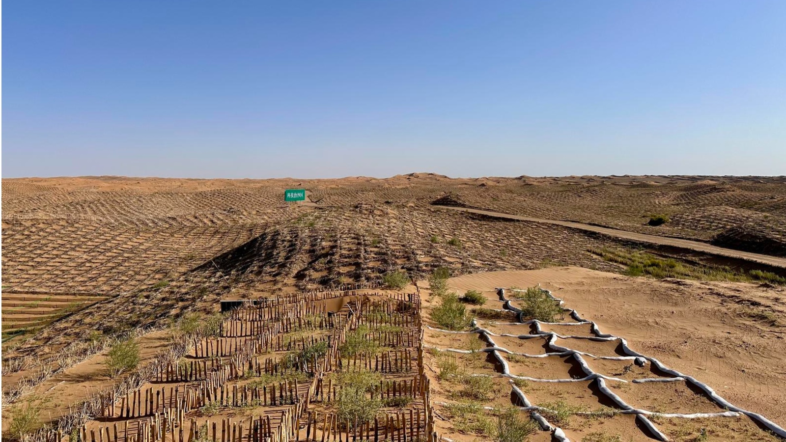 来到时光廊道作业区,“工程固沙+低密度造林+种草”的复合模式正有序推进。在近自然仿生学原理指导下,工人们将传统草方格沙障与可降解拦沙网、生物结皮等新材料搭配使用,梭梭、沙拐枣、柽柳等乔灌草混交林取代了以往单一的固沙树种,在X177线沿线筑起一道兼具生态防护与景观价值的绿色屏障。智慧管护平台的屏幕上,植被覆盖率、土壤湿度等数据实时更新,科技的赋能让治沙效率与质量得到双重提升,这里不仅是治理沙化的作业区,更成为展示民勤生态治理技术的“活窗口”。