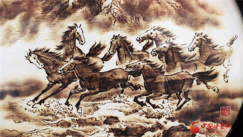从学徒到代表性传承人,张志光的坚守藏在日复一日的练习里。他不仅精通山丹烙画的选材、画面设计及装饰工艺,更在2018年迈出创新步伐——将山丹马元素融入创作。手持电烙铁在木板上游走,他笔下的山丹马或奔腾跳跃、或昂首嘶鸣,线条流畅、明暗有致,仿佛被赋予生命,尽显西北大地的豪迈神韵。“山丹烙画是我一生的热爱,早成了生活里离不开的部分。”张志光的话语里,满是对这门技艺的深情。