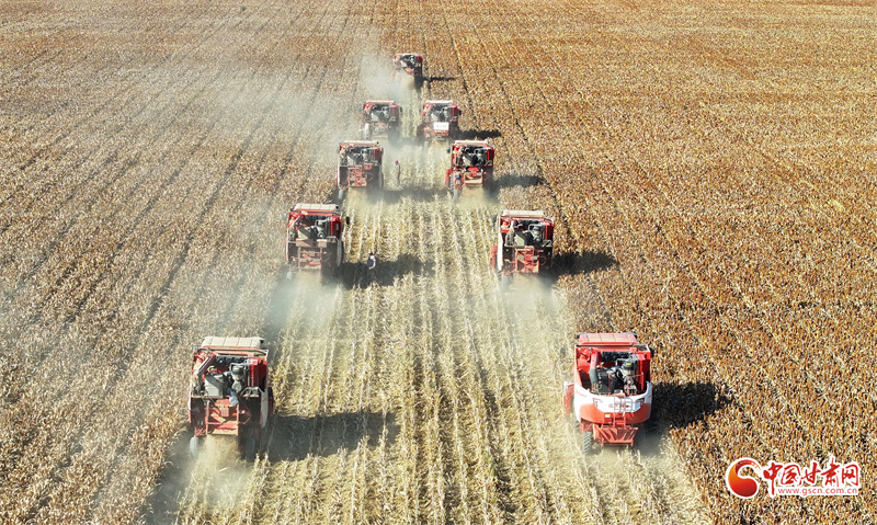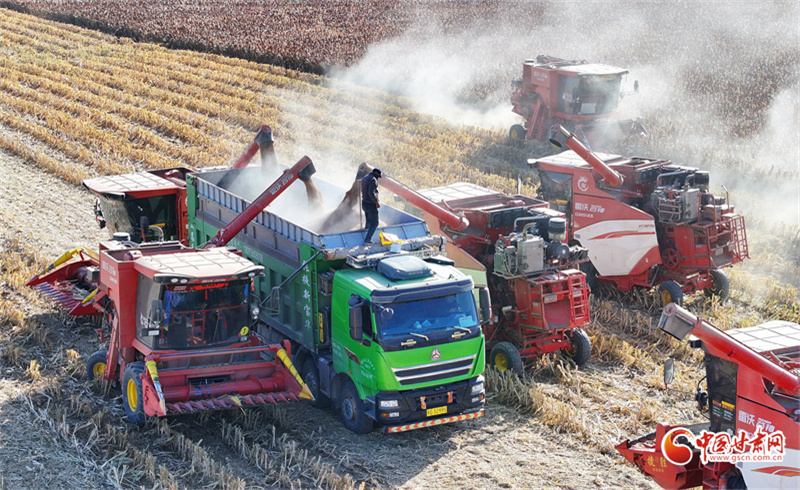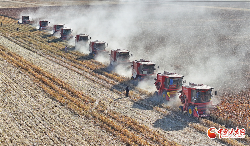 时下,在甘肃省张掖市民乐工业园区滨河集团万亩原粮种植基地,农机手驾驶收割机穿梭田间地头收割高粱,一派繁忙丰收景象。