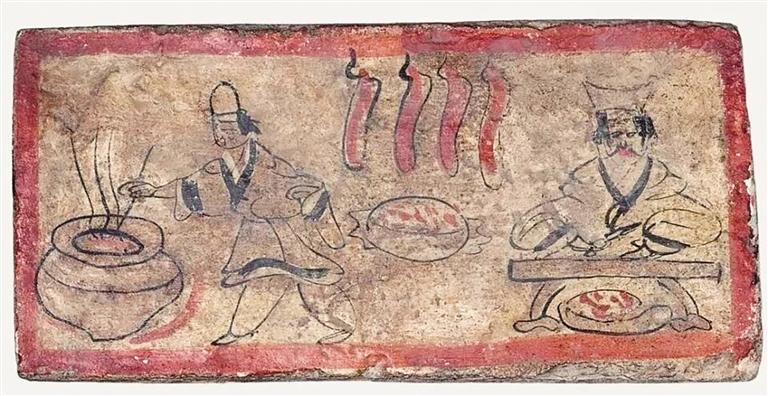 饮食方面,高脂高热的食物成为古人抵御严寒的能量源泉。嘉峪关魏晋墓的画像砖上,生动再现了古人的冬日饮食场景:庖丁正欲宰杀倒悬于木桩之上的羊,屠夫在长几上处理猪肉,长几下还放着存放猪血的盆;另有厨师在案前持刀剔肉,旁侧火盆正烤着肉,仆人将炙好的三股铜(铁)叉递给墓主人……此外,壁画中还有“仆人温酒”的场景,都印证了食用高脂肉类、饮用热酒补充热量是当时普遍的御寒习惯。