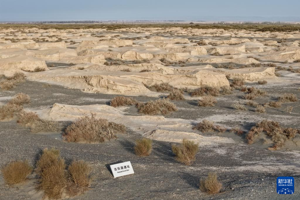 这是11月18日在甘肃省瓜州县拍摄的农业灌溉渠系遗迹中的古渠道遗址(无人机照片)。新华社记者 郎兵兵 摄