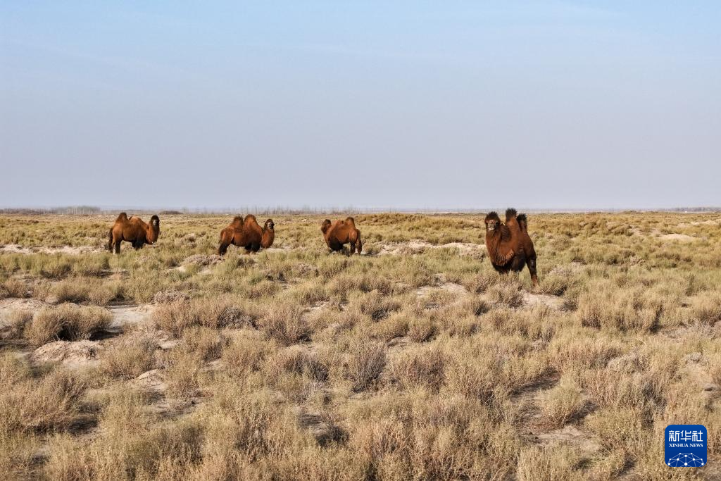 11月18日,一群骆驼在甘肃省瓜州县锁阳城镇的锁阳城遗址外活动觅食(无人机照片)。新华社记者 郎兵兵 摄
