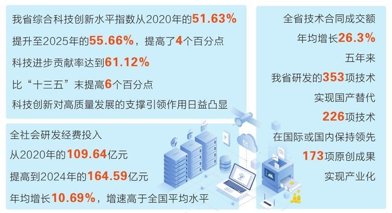 “十四五”以来,最突出的成效是科技综合实力明显提升。我省综合科技创新水平指数从2020年的51.63%提升至2025年的55.66%,提高了4个百分点。科技进步贡献率达到61.12%,比“十三五”末提高6个百分点,科技创新对高质量发展的支撑引领作用日益凸显。全社会研发经费投入从2020年的109.64亿元,提高到2024年的164.59亿元,年均增长10.69%,增速高于全国平均水平。全省技术合同成交额年均增长26.3%。