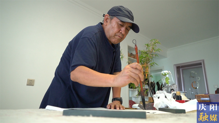 ▲马步升在书房写字。庆阳融媒记者 敬强强摄
