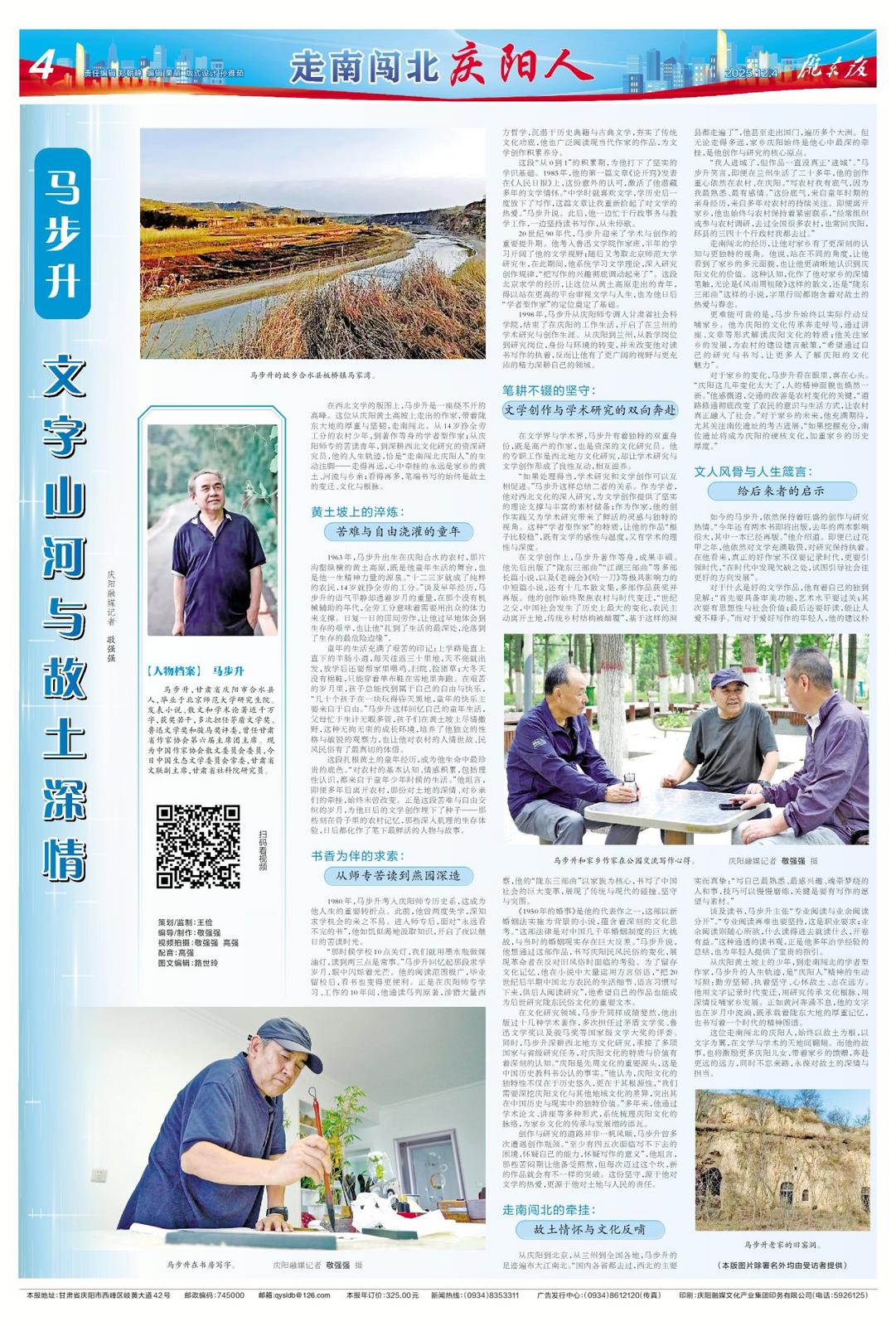 从庆阳黄土坡上的少年,到走南闯北的学者型作家,马步升的人生轨迹,是“庆阳人”精神的生动写照:勤劳坚韧、执着坚守、心怀故土、志在远方。他用文字记录时代变迁,用研究传承文化根脉,用深情反哺家乡发展。正如黄河奔涌不息,他的文字也在岁月中流淌,既承载着陇东大地的厚重记忆,也书写着一个时代的精神图谱。