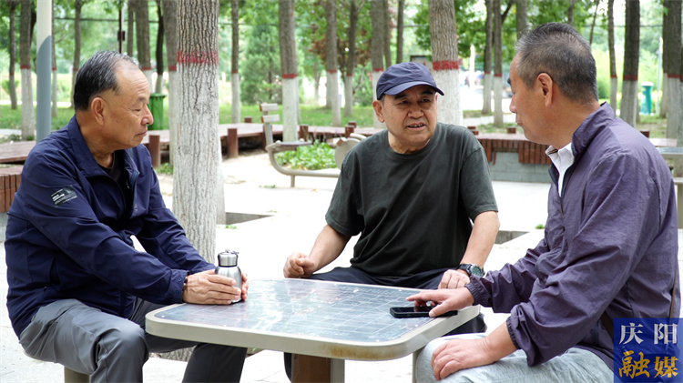▲马步升(中)和家乡作家在公园交流写作心得。庆阳融媒记者 敬强强摄