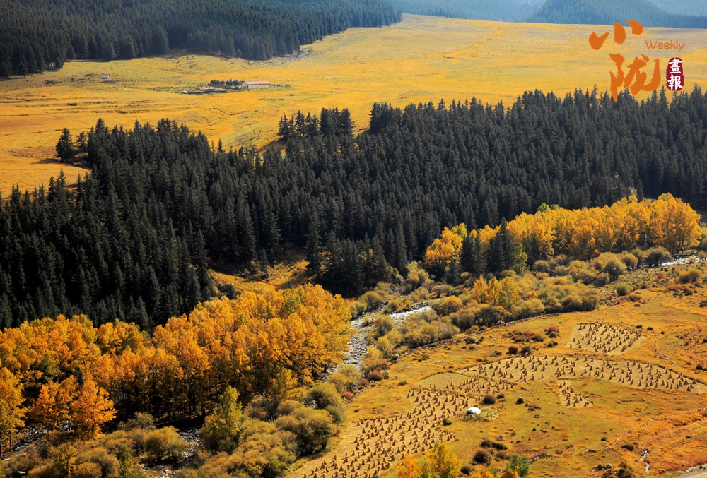 天高地阔,远处的松柏依旧苍翠,近处的草原褪去绿意,染成温柔的浅黄,牛羊点缀其间,游人尽享悠然时光,草原辽阔而宁静,富有诗意。
