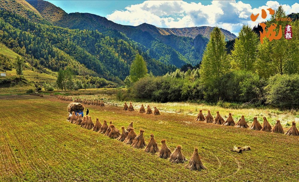 金沙峡依旧满山苍翠,似浓墨泼就。青稞地里,农牧民忙碌地将成熟的青稞收割、扎捆、拉运,丰收的气息弥漫着整个天祝大地。