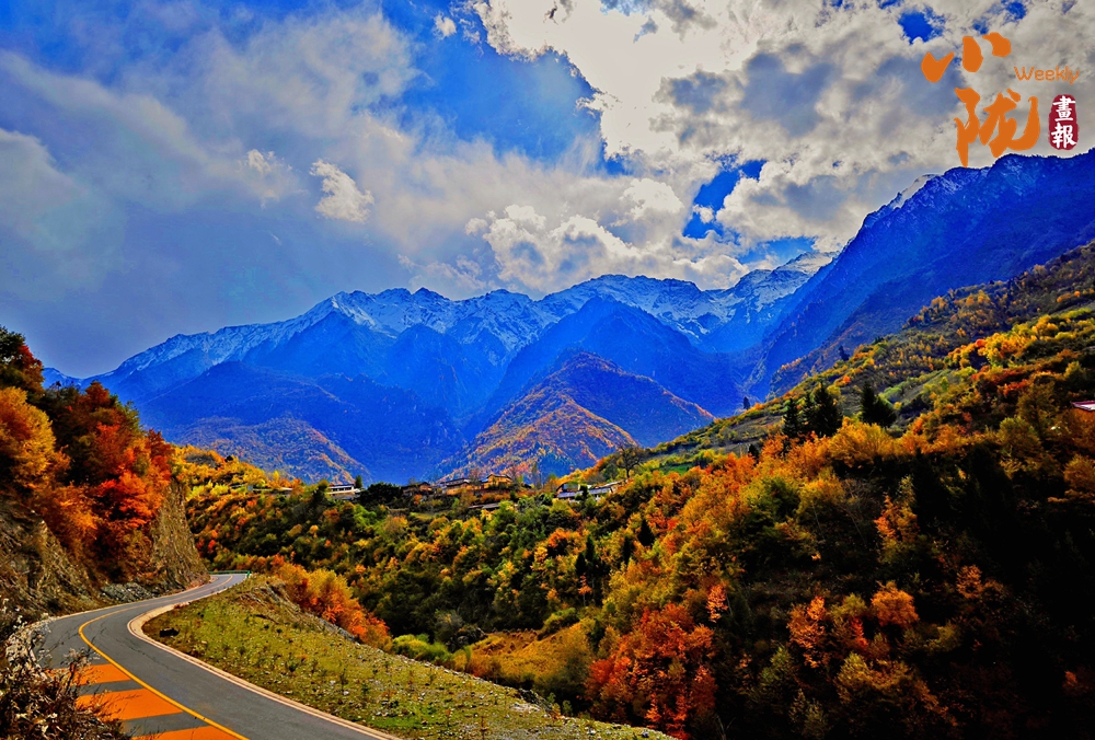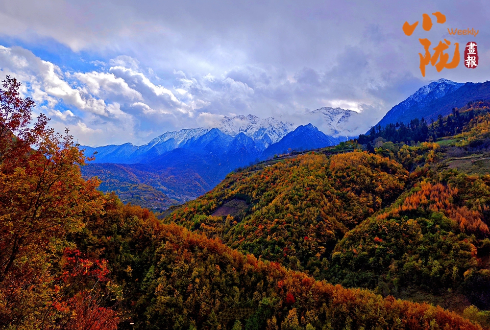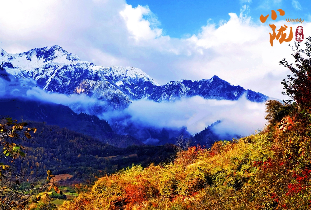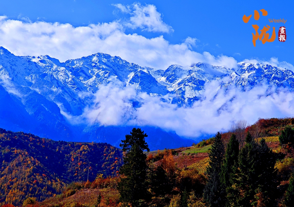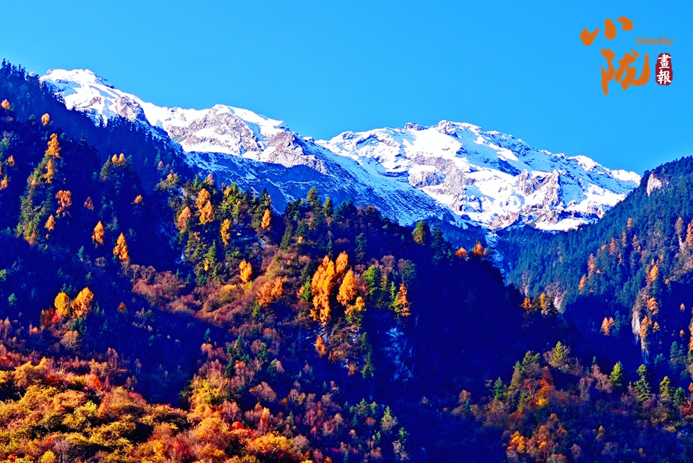 山巅的白雪与彩林形成鲜明对比,红与黄,白与蓝,在阳光的映照下,共同编织出一幅温柔而梦幻的画卷。