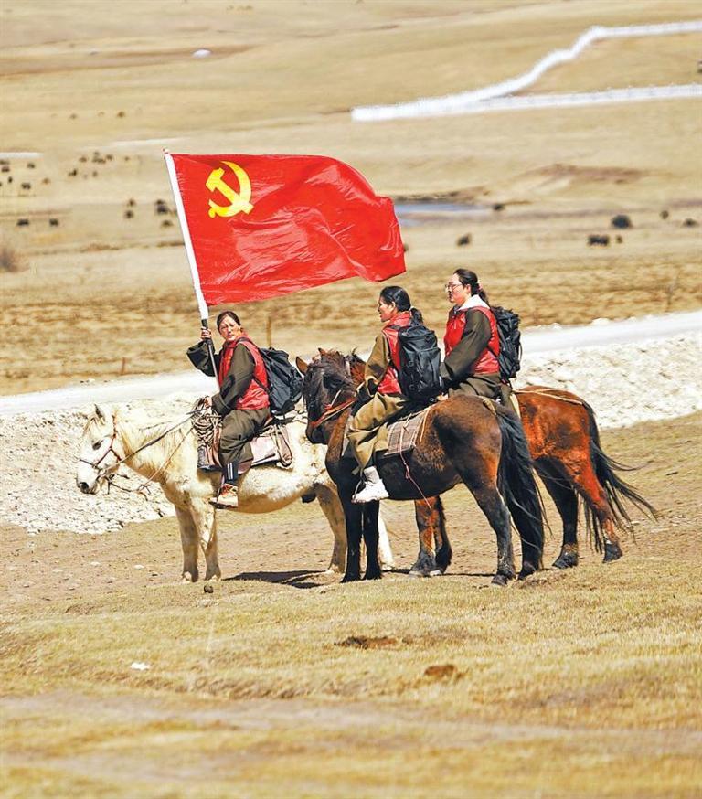 玛曲县齐哈玛镇女子马背宣讲队深入草原宣讲。新甘肃·甘肃日报通讯员 后俊
