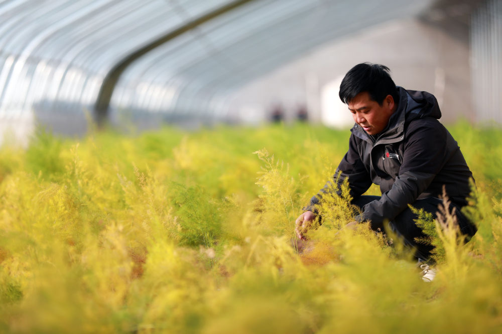 在甘肃省白银市白银区四龙镇现代生态农业(芦笋)种植示范园,负责人吴增刚查看芦笋苗长势。新华社记者 郭刚 摄