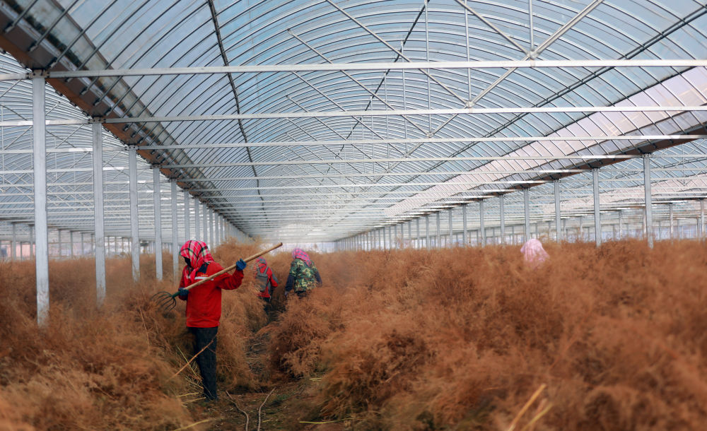 在甘肃省白银市白银区四龙镇现代生态农业(芦笋)种植示范园,当地农民在清理芦笋收获后剩余的秸秆。新华社记者 郭刚 摄