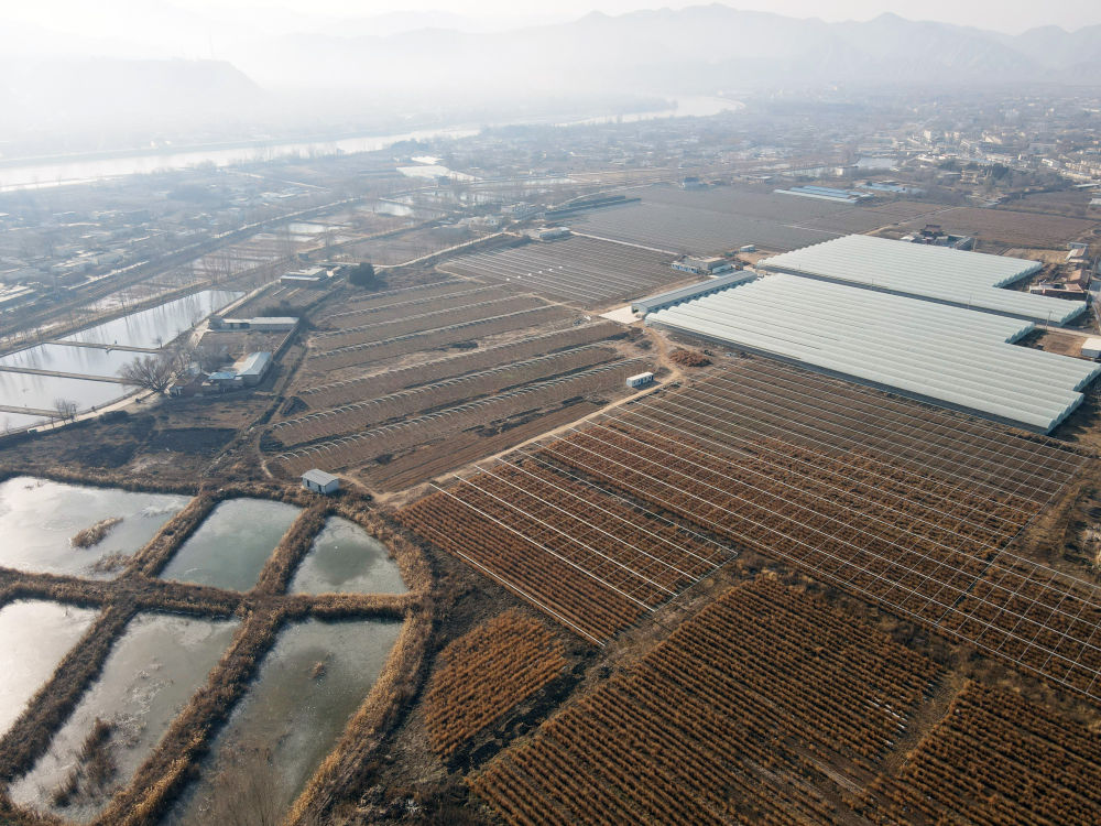 这是位于黄河之滨的甘肃省白银市白银区四龙镇现代生态农业(芦笋)种植示范园(无人机照片)。新华社记者 郭刚 摄