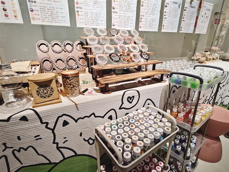 拼豆区域内,陈列着各式成品手链,一旁摆放着制作所需的各种水晶材料,墙上还贴有十二星座水晶佩戴指南,清晰标注了各星座适宜的水晶类型。店里有七八位顾客正低头专注拼豆,氛围宁静而投入。“我们刚才逗了一会儿猫,现在过来做手工。两个人花100多元既能撸猫,还能体验一小时的拼豆,挺划算的。”正在拼豆的李女士分享道,“拼豆颜色很全,我们拼完后,店员会给我们烫好,体验感很好。”