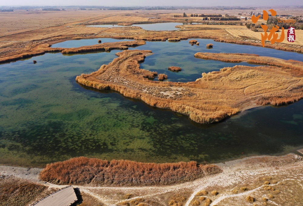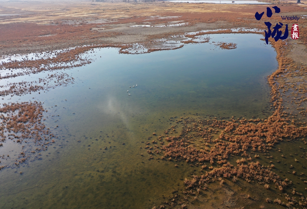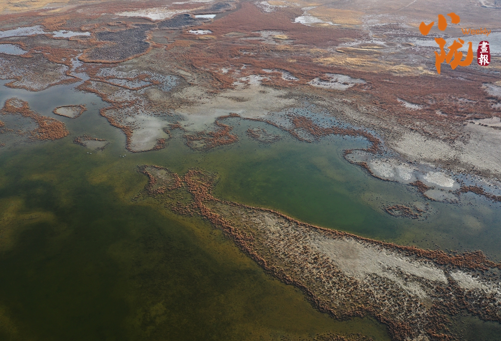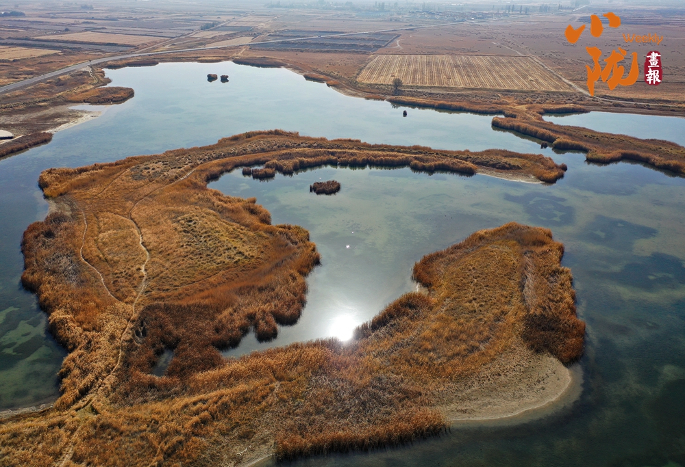 湿地安然舒展在沙海与苍穹之间,仿佛大地的眼眸。它与苍茫四野悄然融合,共同勾勒出一幅“水漾金沙,色染冬暝”的自然水墨。