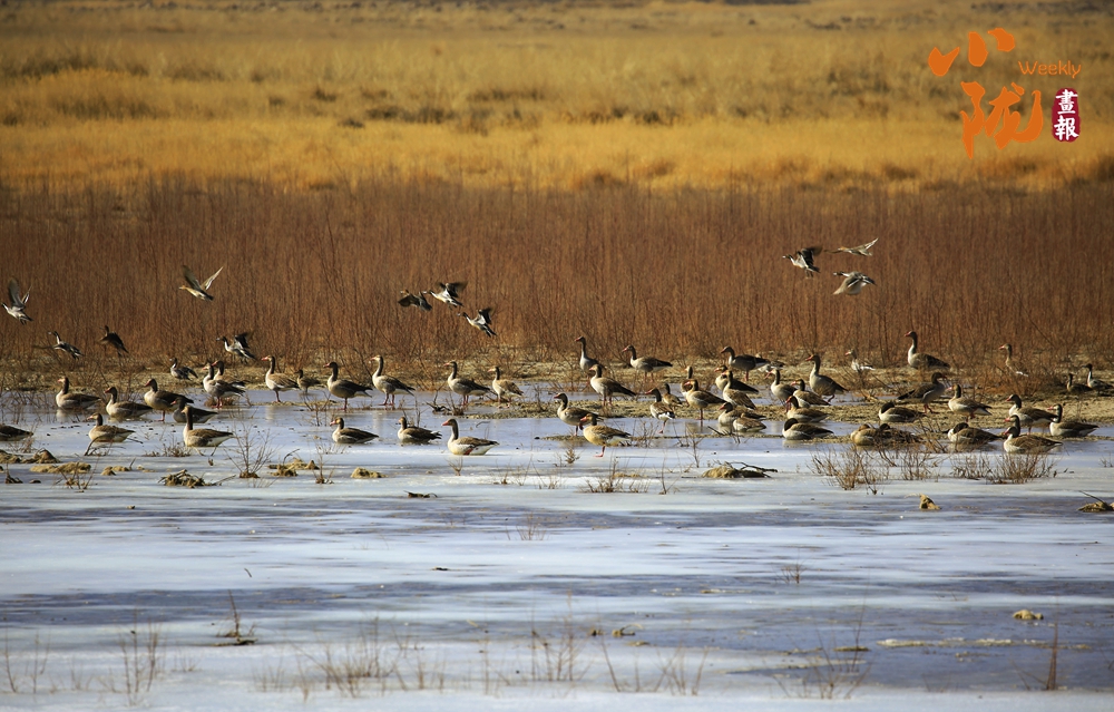 冬日湿地,鸟类或静立冰面,或翩然飞越金黄芦苇。每年候鸟迁飞之季,赤麻鸭等国家重点保护鸟类在此栖身,鸟鸣与苇浪声交织回荡,宛如自然写就的生态诗篇。