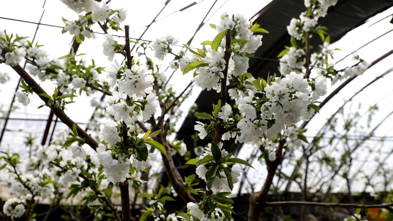 临泽县奋进葡萄种植农民专业合作社负责人贾宏福说:“今年我们还是七个棚的樱桃,现在我们看到的这一个棚和后面的棚,是十一月份升温的,到现在开始开花,马上到授粉期还有一批次到二月底开始升温,到五一就可以上市。”