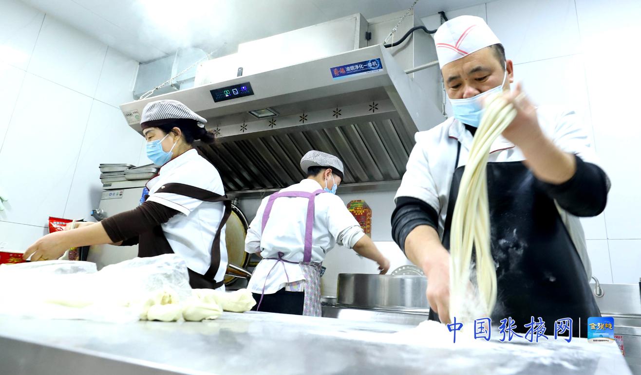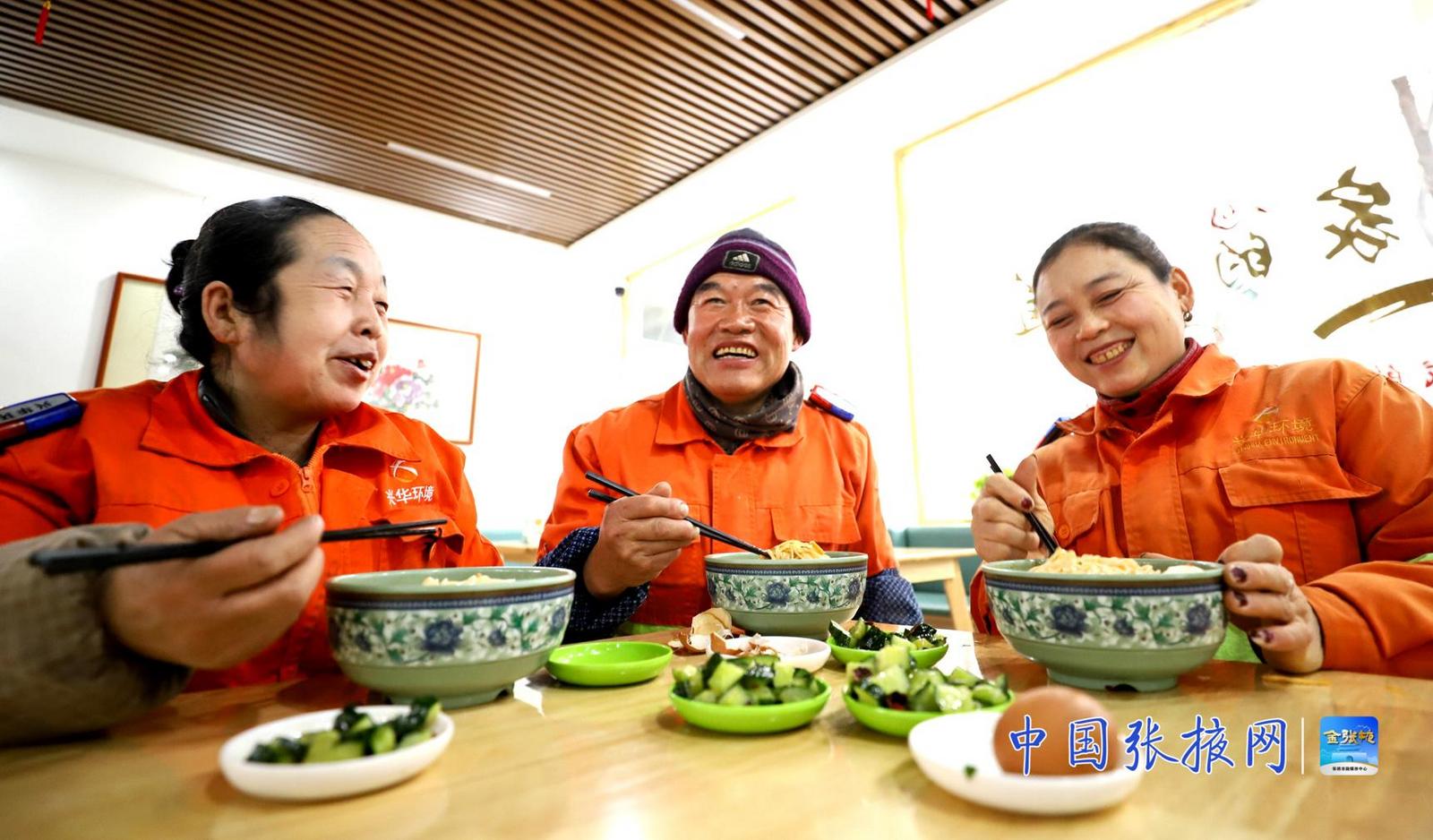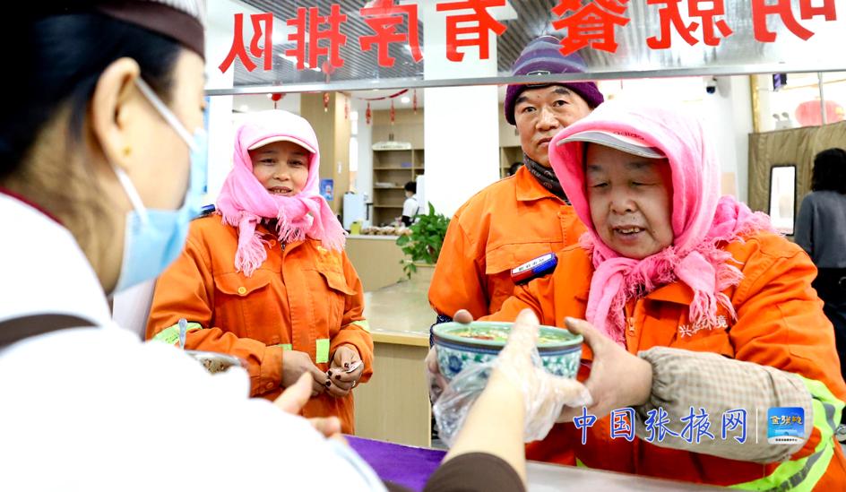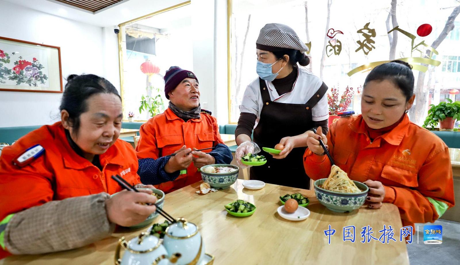 1月29日清晨,张掖市临泽县乐民爱心餐厅内,三位环卫工人坐在餐桌前享用热腾腾的大肉面,寒风中劳作了两个多小时的疲惫和寒冷逐渐消退。