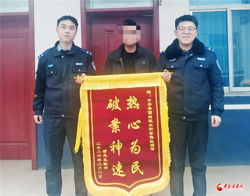 中国甘肃网2月4日讯(西北角·中国甘肃网记者 程健)锦旗凝谢意,警心暖民心。2月2日上午,辖区群众谢先生将一面印着“破案神速 热心为民”的锦旗送到甘谷县公安局西城派出所民辅警手中,以感谢民警快速破获盗窃案、及时为其挽回经济损失。