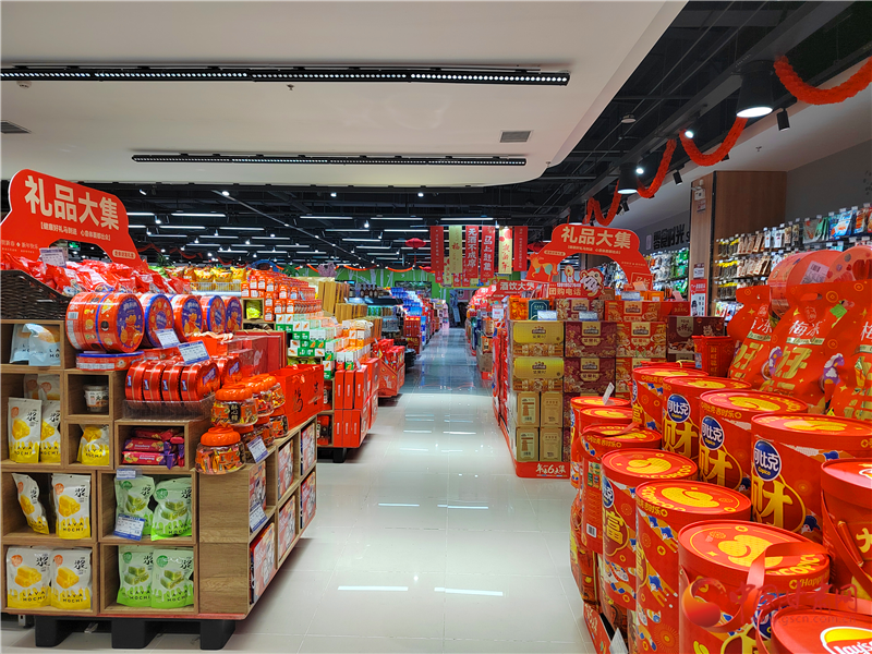 另外一家超市内同样人流如织,节日氛围浓郁醇厚。食品区中,腊味熟食、特色零食种类繁多,包装精美、寓意吉祥的年货礼盒备受青睐,成为市民走亲访友的首选;日用品区各类节庆商品备货充足,一站式购物模式极大便利了市民采购。