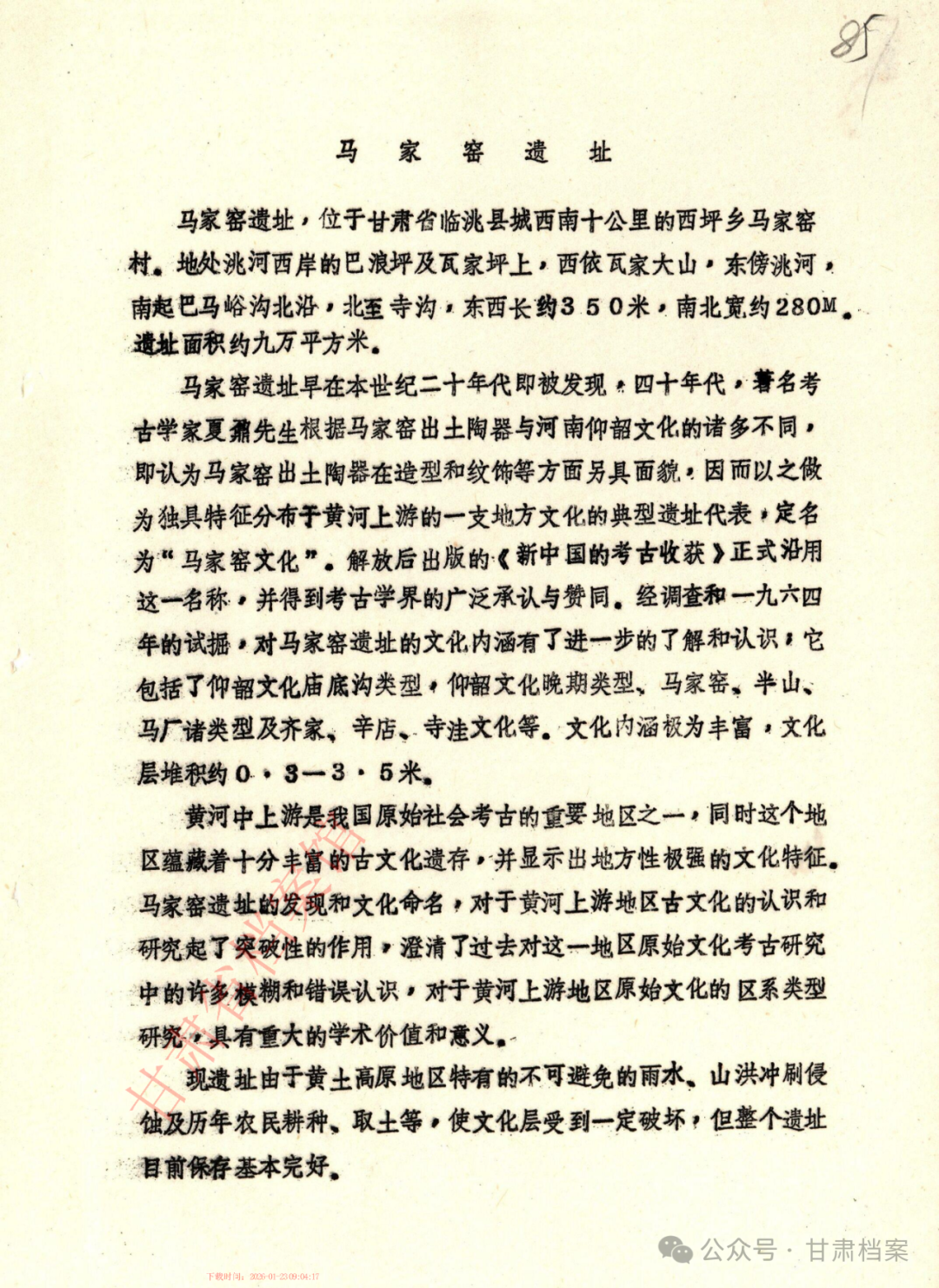 1986年甘肃省文化厅关于马家窑遗址介绍的档案(现存甘肃省档案馆)
