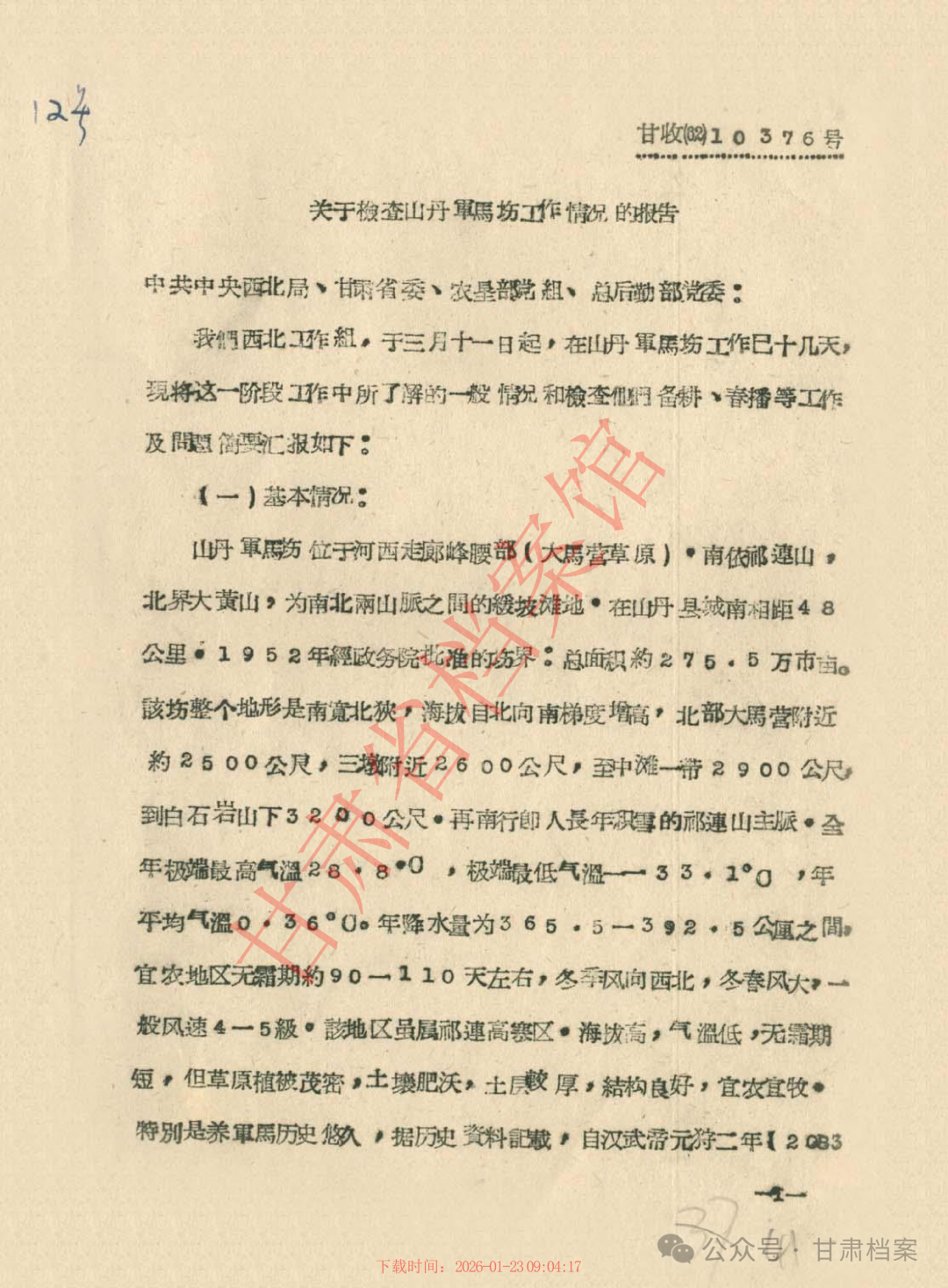 1962年关于检查山丹军马场工作情况的报告(现存甘肃省档案馆)