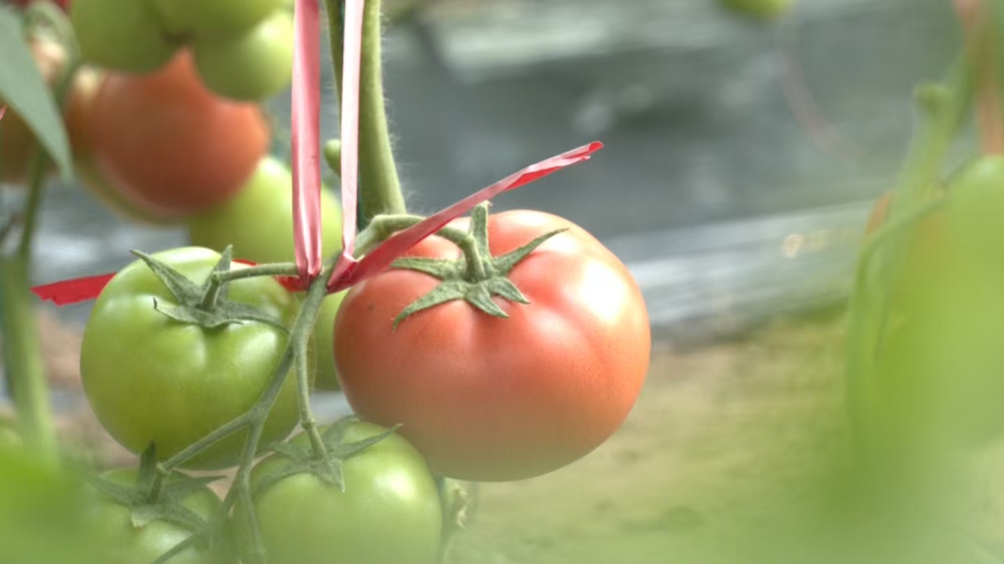 在日光温室基地的西红柿大棚里,承租户李记信步履匆匆,在行架间来回穿梭,俯身查看果实长势、抬手摘下成熟的西红柿,动作娴熟而麻利。谈及近期蔬菜价格和收成,他的脸上瞬间绽开笑容,眉眼间满是丰收的喜悦与踏实。