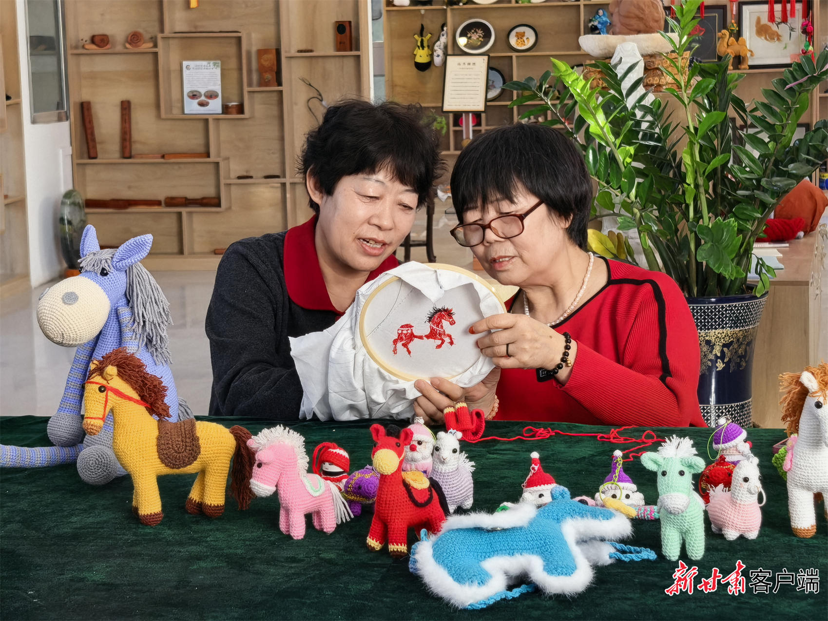 在山丹县非物质文化遗产研发中心,市级非遗刺绣传承人车静捏着针,和县级非遗刺绣传承人陈秀英讨论刺绣的走笔、图案和颜色:“马尾巴用黑线更精神,马鞍绿色好一点,但不能太突兀,要把背上的元宝显出来。”