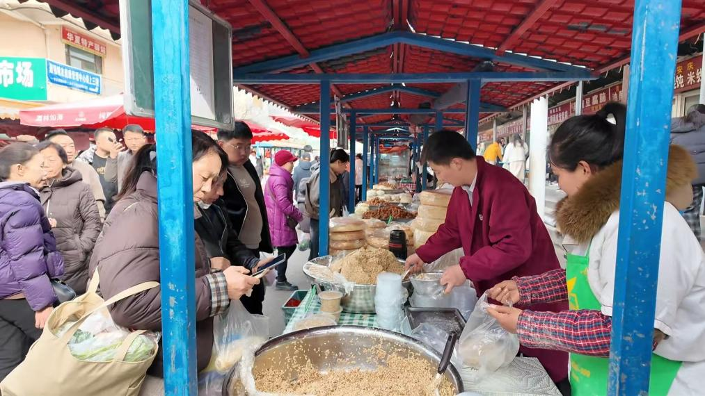 坚家河大集的这口老锅已经沸腾了十八年,锅里有甜醅的汤,有炸丸子的香,和着面皮料汁里的酸酸辣辣,迎着风,追着春光,锅气不散,年味不绝。