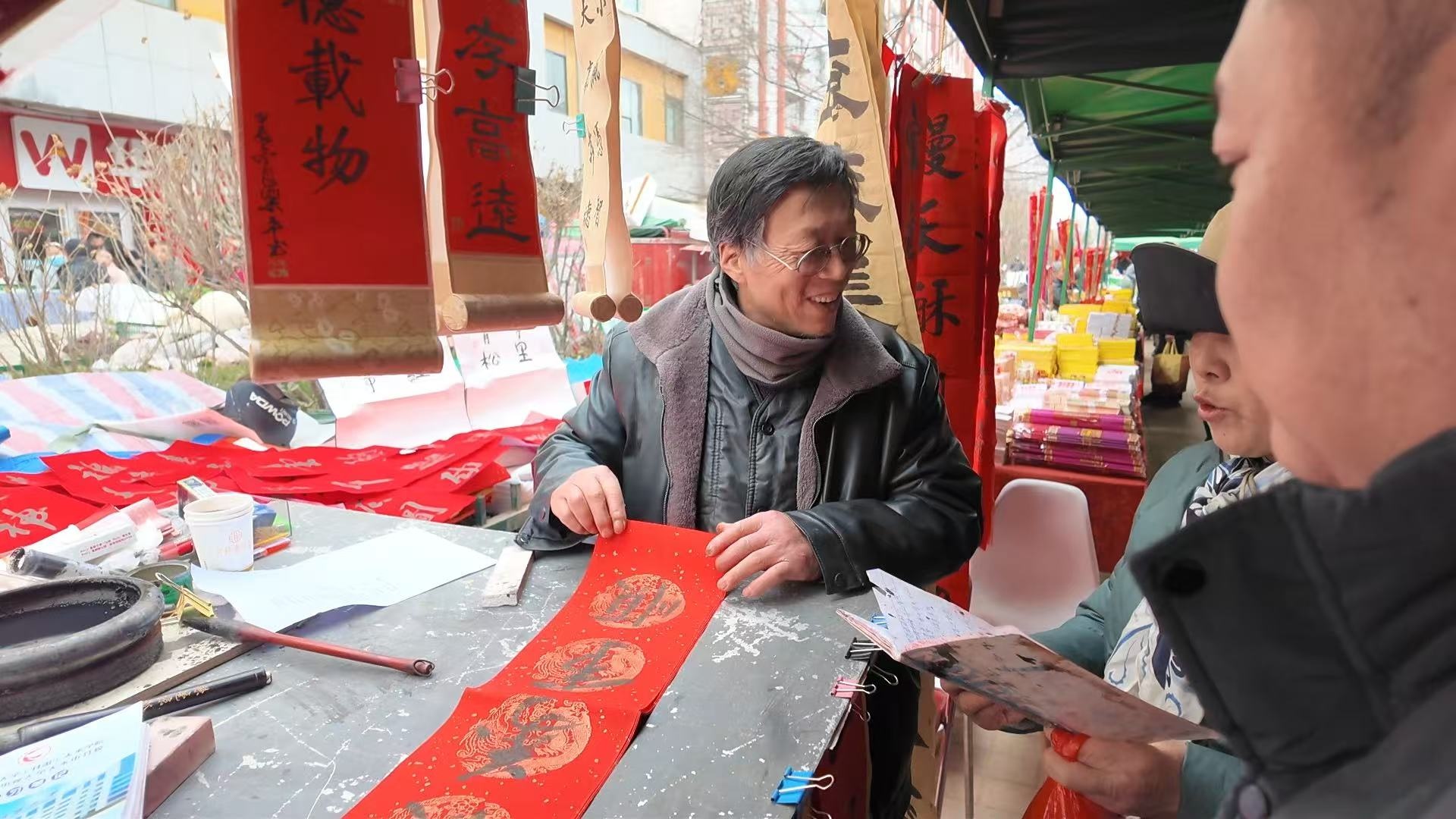 穿过果蔬区,人潮里忽然辟出一小片安静。62岁的张乐平老人,在大集北头一张简易书桌前俯身写对联。笔锋落下,红纸黑字,霸气的对联写得过瘾。