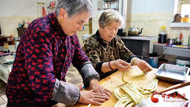 走进南华镇胜利村村民王会芳家中,她和邻居正忙活得热火朝天。案板上,和好的面团被擀成薄厚匀称的面片,刀起刀落间,小方块排列整齐,一扭一翻,蝴蝶结、麻花瓣、小元宝……各式花样的油果子便呈现在眼前。灶上的油锅已经烧热,胡麻油的香气弥漫整个屋子,油果子滑入锅中,“滋啦”一声,瞬间在滚烫的油锅里上下翻腾,渐渐变得金黄酥脆。