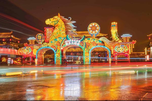 丙午新岁,陕西省西安市大唐芙蓉园门前华灯璀璨。巨型骏马灯组昂首腾空,身披盛唐锦绣,与古建飞檐交相辉映。光影流转间,千盏华灯点亮千年古都,以万马奔腾之势,开启充满希望的新一年。(陕西省西安市轨道交通集团纪委供 杨依恬 摄)