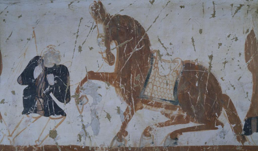 莫高窟第290窟北周时期的壁画中,绘有驯马“名场面”。驯马师一手扬鞭、一手持缰,枣红色的骏马身披鞍鞯、体格健硕,向前扬起一蹄,重心向后退缩。壁画以红、白为主色调,线条简练有力。敦煌研究院融媒体中心馆员王嘉奇介绍,驯马师高鼻深目、脚穿长靴,具有胡人的特征,壁画折射出丝绸之路上多元文明的交往。