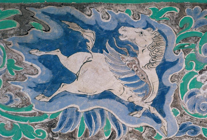 古人对马充满了浪漫想象。在有莫高窟“姊妹窟”之称的榆林窟,第10窟藻井外围的装饰花边绘有一匹通体白色、回首奔驰的翼马。王嘉奇介绍,白马有着蓝色羽翼,两条前腿交叉腾踏,两条后腿凌空飞奔,臀部和大腿肌肉发达。翼马造型简练、体态优美,是同题材的佳作。