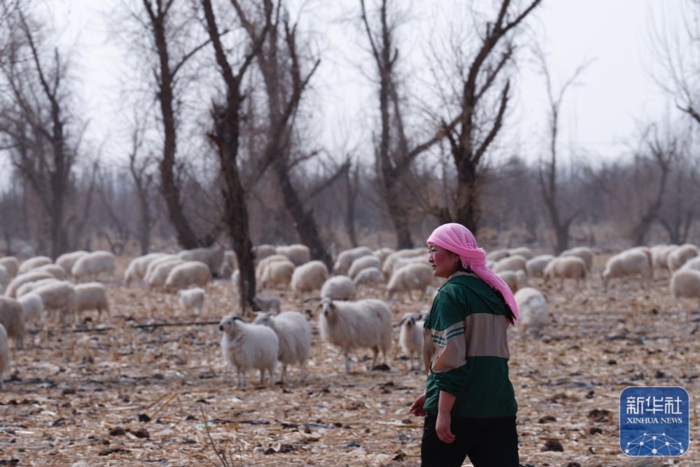 3月7日,在甘肃省张掖市甘州区碱滩镇二坝村的借牧点,东宝的儿媳拉中在放牧。新华社记者 张龙 摄