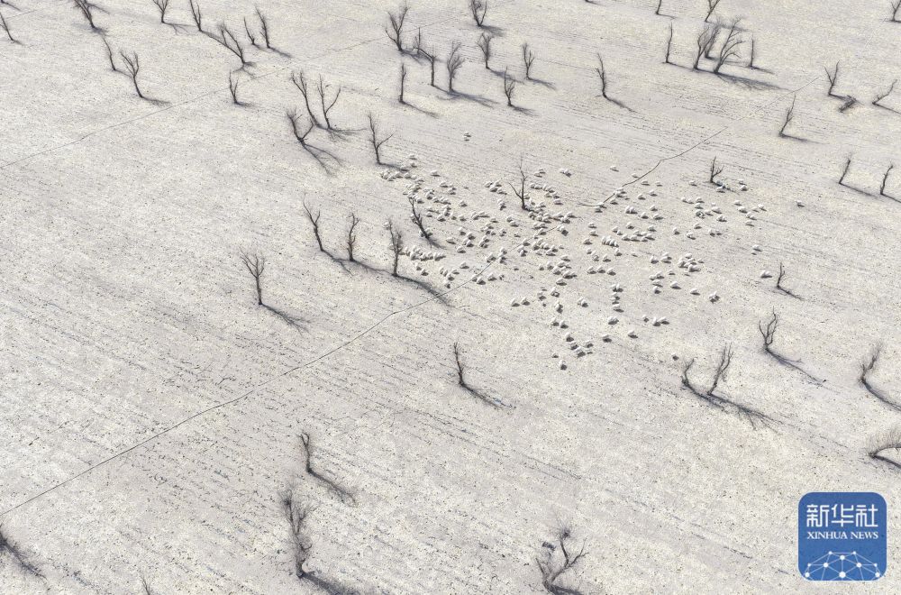 3月7日,在甘肃省张掖市甘州区碱滩镇二坝村的借牧点,羊群在玉米秸秆地中觅食(无人机照片)。新华社记者 张龙 摄