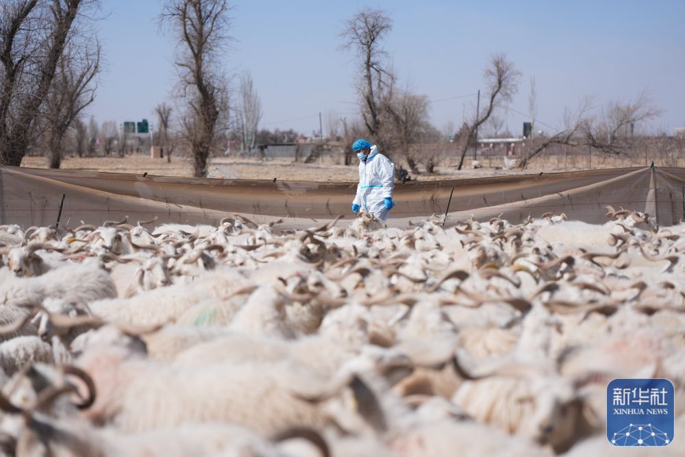 3月7日,在甘肃省张掖市甘州区碱滩镇二坝村的借牧点,祁连县农牧部门专业技术人员对返场装车前的羊群进行健康检查。新华社记者 张龙 摄